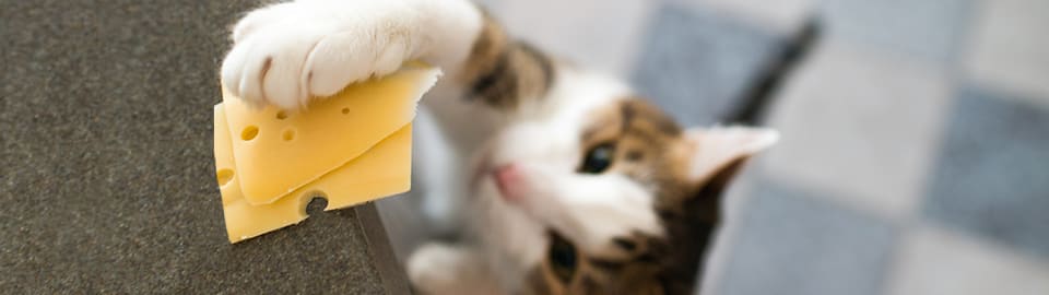Human foods like cheese should only be given to cats occasionally and in small quantities. The majority of your cat’s calories should come from foods specially formulated to give them the nutrients they need, such as a commercially available cat food. Be sure to consult your veterinarian before adding new foods to your pet's diet.